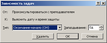 В раскрывающемся списке Тип (Type) можно выбрать тип связи, в поле со счетчиком Запаздывание (Lag) указать временной интервал между связанными задачами. Кнопка Удалить (Delete) позволяет удалить связь.