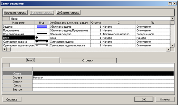 Окно состоит из двух основных блоков. Верхний блок содержит таблицу, в которой определяются отражаемые на диаграмме типы отрезков. Нижний блок содержит две вкладки с параметрами, определяющими внешний вид типов отрезков, указанных в верхнем блоке.