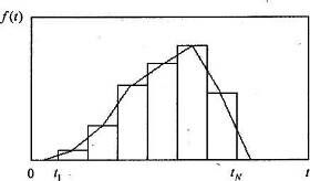 , где Ni – число выборочных значений, попавших в данный интервал (рис. 1.4). Гистограмма является статистической плотностью распределения времени работы до отказа. Для оценки плотности иногда используется также полигон относительных частот, который представляет собой ломаную линию, построенную по точкам, абсциссами которых являются середины интервалов Δi = 1, 2,..., k, а ординаты соответствуют плотностям