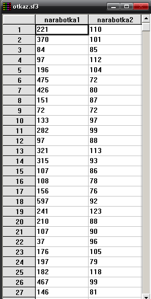 1. Подготовка исходных данных к статистической обработке для двух наборов одновременно. С этой целью запускаем StatGraphics Plus, создадим две переменные (2 столбца) с именами narabotka1 и narabotka2, сохраним их в файле с именем OTKAZ. Для этого необходимо вызвать меню File и выбрать соответствующие пункты подменю Save\Save Data File или нажать комбинацию клавиш Shift+F12.