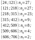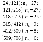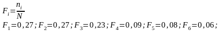 Количество отказов выборки, попавших в i-ый интервал(количество чисел, в данном интервале из таблицы 1):