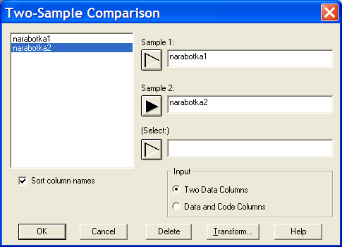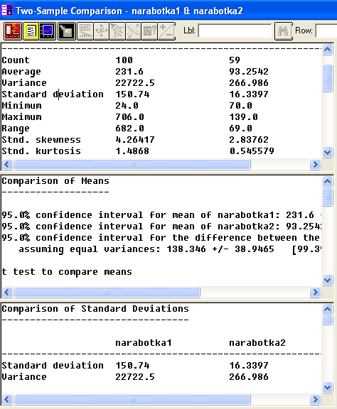 Длины переменных narabotkal и narabotka2 соответственно равны 100 и 65, что соответствует количеству чисел в табл. 1.2 и 1.4.