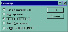 Чтобы изменить регистр букв в выделенном фрагменте, можно выполнить команду Регистр (Change Case) из меню Формат (Format) и установить подходящую опцию в окне диалога Регистр (рис. 3). Кроме того, вы можете нажать Shift+F3 (при необходимости несколько раз) и выбрать подходящий вариант изменения регистра.