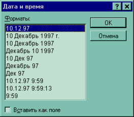 Наконец, можно вставить в текст документа текущее время и дату – для этого выполните команду Дата и время (Date And Time) из меню Вставка и найдите в появившемся списке подходящий формат. Если установить флажок Вставить как поле (Insert As Field), то Word автоматически будет обновлять дату и время при каждой печати документа; в противном случае дата и время останутся такими, какими они были в момент вставки.