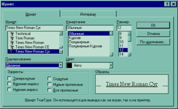 При открытии диалога Шрифт в нем показаны текущие атрибуты формата выделенного текста. Если значение какого-либо атрибута изменяется в выделенном тексте (например, некоторые символы – полужирные, а другие – нет), то поле, соответствующее этому атрибуту, остается незаполненным (или, если атрибут включается установкой флажка, маркер будет серого цвета).