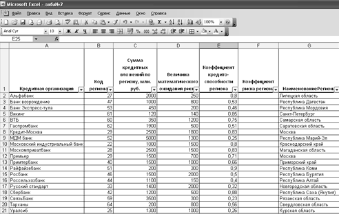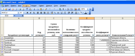 Введем формулу в ячейку F1 коэффициент риска региона = Сумма кредитных вложений по региону / (Величина математического ожидания риска*Коэффициент кредитоспособности региона);
