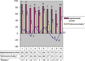 В исследовании участвовало 30 респондентов, из которых 15 женщин и 15 мужчин. Суммируя полученные результаты по всем шкалам и усредняя их по всем участникам опроса, мы построили «эталонный» график для идеального, рекламного ролика с участием ребенка. Затем на этот график накладываются кривые, выстроенные на основе эмпирических данных. Перед заполнением бланков участникам исследования демонстрировались телевизионные рекламные ролики (масла для тела «Johnson’s babe» - табл.2 и туалетной бумаги «Kleenex» - табл.3).
