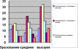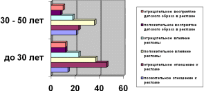 Как видно из рисунка, образование влияет на восприятие рекламы. Самые высокие показатели отрицательного отношения к рекламе у респондентов с высшим образованием, хотя они не отрицают положительного влияния рекламы (помогает узнавать о новых товарах, ориентирует человека в выборе товара). И не допустили бы участие своего ребенка в рекламе.