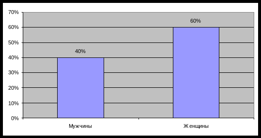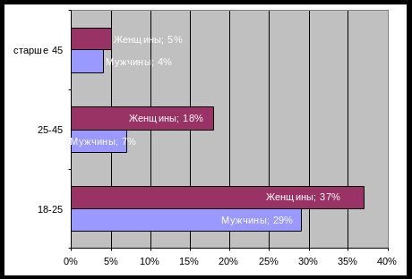 Данные рисунков 1-2 позволяют сделать следующие выводы: в обследование приняли участие 40 мужчин и 60 женщины различных возрастов и рода деятельности. Основная масса прошенных - это люди в возрасте от18 до 25 лет.