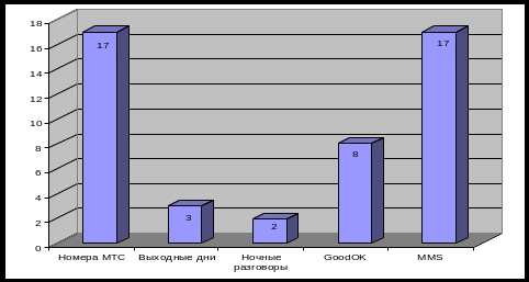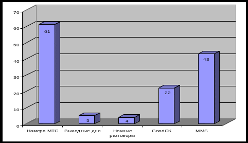 Из этой диаграммы мы видим, что наибольшей популярностью пользуется услуга "Номера МТС", на втором месте услуга "MMS".