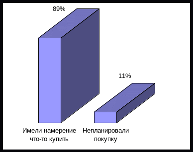 Подавляющее большинство опрошенных совершили покупку, имея намерение что-то купить до входа в магазин. Импульсивные (незапланированные) покупки совершались крайне редко (11%).