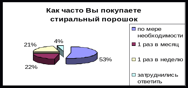 На вопрос «Как часто Вы покупаете стиральный порошок?» 53% респондентов ответили по мере необходимости, 22% - 1 раз в месяц, 21% - 1 раз в неделю и 4% затруднились ответить.