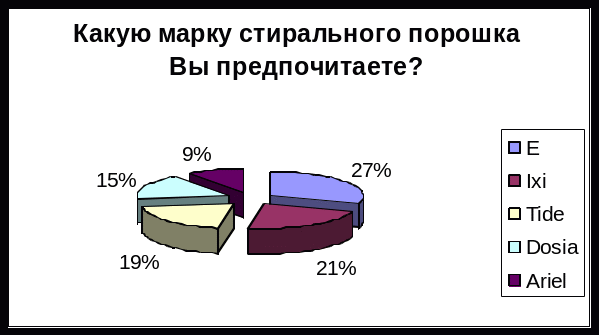 В основном потребители предпочитают следующие марки порошка: E – 27%, Ixi – 21%, Tide – 19%, Dosia – 15%, Ariel – 9%.