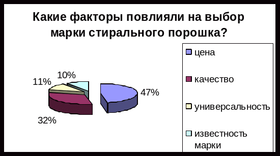 Больше всего на выбор порошка влияют такие его характеристики, как: цена (47%), качество (32%), универсальность (11%), известность марки (10%).