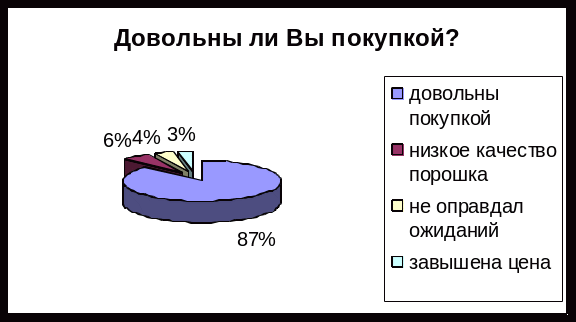 87% респондентов отметили, что покупкой они довольны и претензий не имеют. 6% пожаловались на низкое качество купленного порошка. 4% заявило, что ожидало большего эффекта. 3% отметили, что цена слишком завышена.