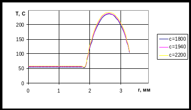 Рис. 13. Распределение температуры по радиусу для различных удельных теплоемкостей