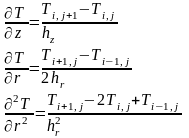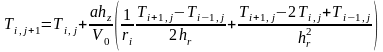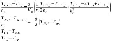 t1 [i]:=t[i]+lamdai/(ci*roi*v0)*hz1*(1/r*((t [i+1] – t [i‑1])/(2*hr2))+(t [i+1] – 2*t[i]+t [i‑1])/(hr2*hr2));