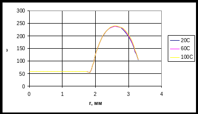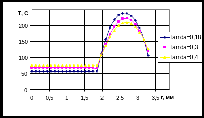 Рис. 10. Распределение температуры по радиусу для различных коэффициентов теплопроводности