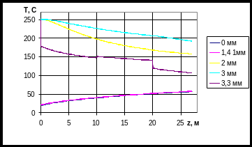 Рис. 4. Распределение температуры по длине охлаждающих ванн
