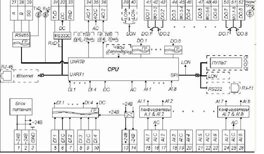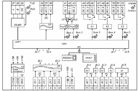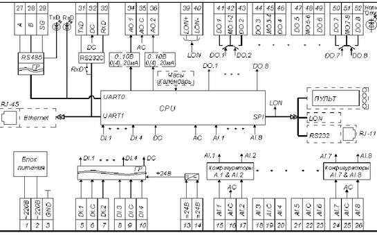 Аппаратное устройство ввода информации содержит гальванический разделитель (ГР) для дискретных входных сигналов DI.1…DI.4 и конфигураторы для аналоговых входных сигналов AI.1…AI.8.
