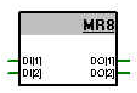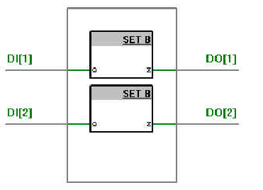 Модуль MR8 применяется здесь в качестве обыкновенного усилителя входных сигналов для их подачи непосредственно на КЗР. Входы модуля DI[1] и DI[2] нужно передать без изменения на выходы DO[1] и DO[2], соответственно. Для этого между входами и выходами вставлены простейшие ФБ цифровых уставок SET B (рис.8).
