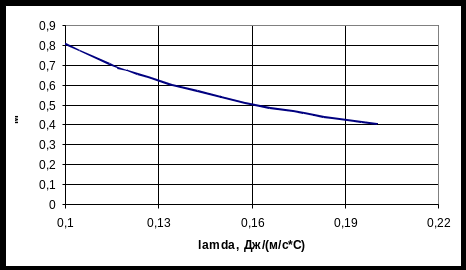 Рис. 13. Зависимость длины зоны загрузки от коэффициента теплопроводности полимера