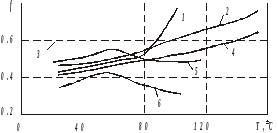 Рис. 4. Зависимость коэффициента трения от температуры для полимеров: 1 – ПВХ; 2 – полиамид 6.6 (сорт А); 3 – полиамид 6.6; 4 – полиамид 6.6 (сорт В); 5 – полипропилен; 6 – полиэтилен.
