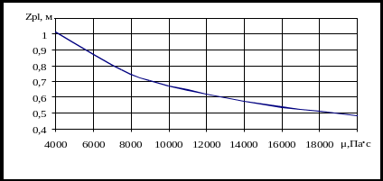 Рис. 10. Зависимость длины зоны плавления от вязкости