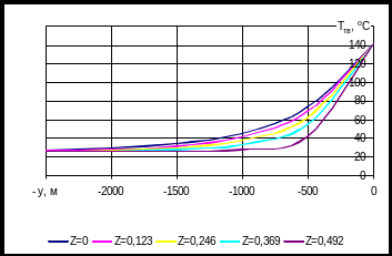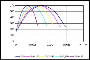 Рис. 3. Распределение температуры в зоне плавления по высоте канала для жидкой фазы