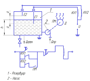 Дана АСР забезпечує підтримку заданого рівня води в резервуарі, запізнення в системі відсутнє. Із резервуара вода подається до споживача за допомогою насоса. Витрата Qот незалежить від рівня води в резервуарі. Заданий рівень води hзд=9м. Відцентровий насос, який подає воду в резервуар забезпечує витрату Qзд.пр=Qзд.от. Ця рівність справедлива при числі обертів nзд= 0,5nном. Коефіцієнт передачі об’єкта Kоб=9∙10-3с-1. Допустиме число вмикань двигуна m=19 вм/год.