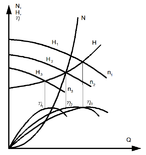 Характеристиками центробежных насосов называют – графические зависимости параметров: напора Н, мощности N, КПД η от подачи Q при постоянной частоте вращения ротора n и неизменных значениях плотности и вязкости жидкости: Н(Q), N(Q), η(Q) рисунок 3.