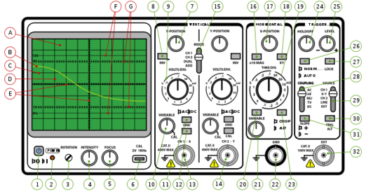 Электронно-лучевой осциллограф имеет экран A, на котором отображаются графики входных сигналов. На экран нанесена разметка в виде сетки. У цифровых осциллографов изображение выводится на дисплей (монохромный или цветной) в виде готовой картинки. У аналоговых осциллографов в качестве экрана используется электронно-лучевая трубка с электростатическим отклонением.