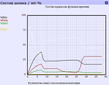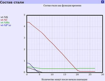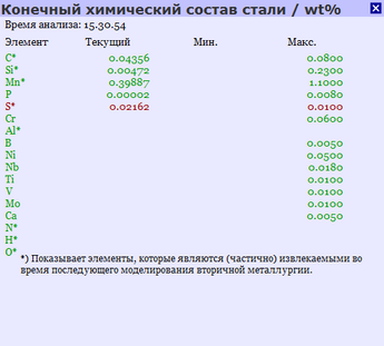 В результате моделирования выплавки стали кислородно-конвертерным процессом была получена на выходе сталь с требуемым химическим составом и температурой с небольшим отклонением по содержанию серы. Это связано с тем, что в ходе конвертерного сталеплавильного процесса невозможно удалить серу до допустимо количества. Эту проблему решают с помощью внепечной обработки стали, где доводят ее концентрацию до нужного предела. Необходимо отметить, что модель выдаёт флуктуации по исходному хим. составу, что затрудняет предварительный расчет шихты, также наблюдается неадекватная реакция программы на некоторые технологические операции. В целом можно отметить, что для попадания в хим. состав и температуру необходим некоторый опыт моделирования в данной среде.