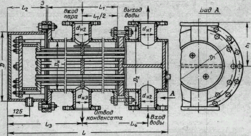 | Тип теплообменника | Коэффи-циент теплопе-редачи k, ккaл/(м2·ч·гpaд) | Темпера-турный напор t, °С | Поверх-ность нагрева F, м2 | Диаметр корпуса D, м | Длина корпуса L, м | Гидравли-ческое сопротивление p, мм вод. ст | Число ходов z |