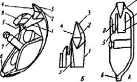| Човник (машини “Подольськ” 142 кл, “Чайка”): А - права сторона; Б - ліва сторона; 1 - права кромка широкої полиці; 2 - права внутрішня кромка носика; 3 - права зовнішня кромка; 4 - ліва внутрішня кромка; 5 - внутрішня кромка широкої полиці; 6 - лівий внутрішній кут хвостовика; 7 - широка полиця; 8 - вузька полиця |