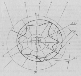 Круглограмма представляет собой бумажный диаграммный диск 1 (рис. 6), с центром в точке О. В исходной прямоугольной системе координат точку О принимают за центр контура геометрического профиля поперечного сечения вала (см. рис.1).