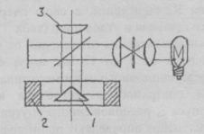 Образцовой поверхностью нутромера является поверхность доведенного конуса 1, расположенного внутри проверяемого кольца 2. Величину отклонения определяют по интерференционной картине, возникающей в поле зрения окуляра 3 при взаимодействии пучков света, отразивших от исследуемой и образцовой поверхностей. Точность измерения достигает 0,03- 0,05 мкм.