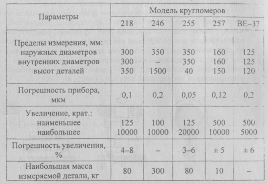 По принципу измерительных систем кругломеры могут быть электромеханическими, индуктивными или пневматическими. Перед измерением деталь центрируют, относительно оси вращения. Сигналы измерительной головки, предварительно усиленные и записанные в полярных координатах, представляют собой круглограмму, сравнение которой с прилегающей окружностью позволяет оценить отклонение от круглости проверяемой детали. .Техническая характеристика кругломеров приведена в таблице 2.