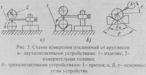 Двухконтактные устройства позволяют выявлять огранку с четным числом граней и овальность. Трехконтактные устройства представляют собой комбинацию призмы с заданным углом раскрытия и измерительной головки.