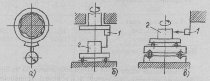 а- в кольце; б- кругломером с вращающимся измерительным наконечником / и неподвижной деталью 2; в- с неподвижным наконечником 1 и вращающейся проверяемой деталью 2