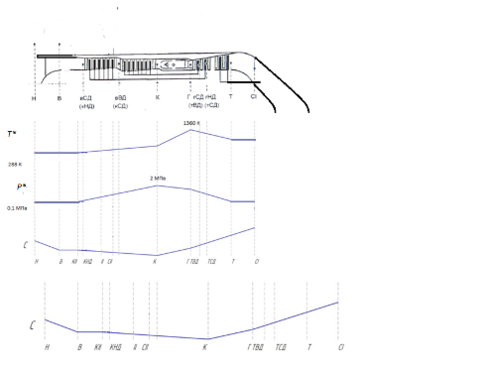Схема трехвального ТВАД с коротким наружным каналом и изменение параметров рабочего тела в проточной части внутреннего и наружного контуров (гидравлические потери давления и температуры на входе и выходе не учитываются)