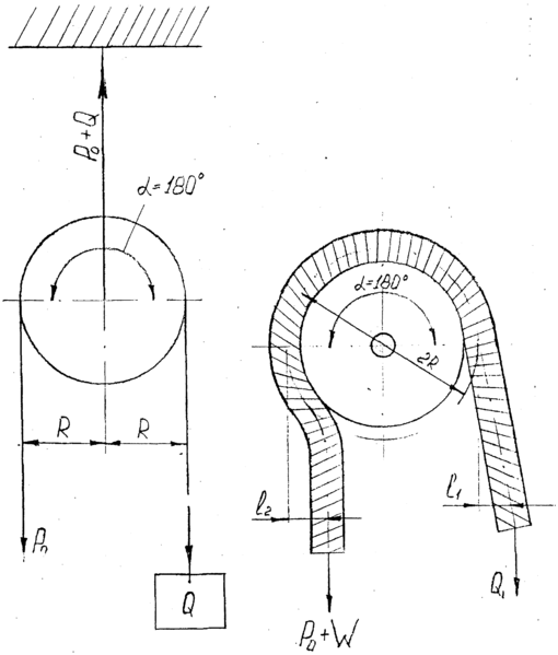 Таким образом, ясно, что для гибкого элемента, при работе его на блоке, сбегающая ветвь всегда натянута сильнее, чем его набегающая ветвь, а величина коэффициента (К) всегда будет больше единицы и является обратной величине к.п.д. неподвижного блока.
