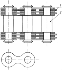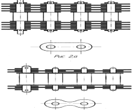 Эти цепи применяют при скорости не свыше V= 1,5 м/сек. Конструкция цепей имеет сходство с ранее рассмотренными приводными цепями. Цепи состоят из пластин 1, которые шарнирно соединены между собой круглыми валиками 2 (рис. 2). Число пластин зависит от нагрузки на цепь и может быть в пределах от 2 до 12. Пластины удерживают на цапфах валиков, которые расклёпаны на концах; применяют и другие способы фиксирования пластин на цапфах, в том числе шплинты с шайбами или без них (рис. 2 а, б).