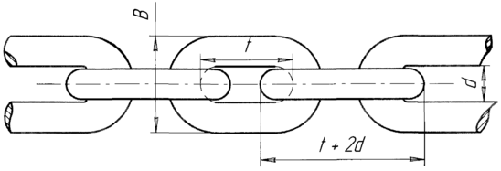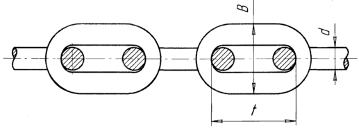 Грузовые цепи бывают двух видов, различаемых по конструкции и методу их производства. Грузовые сварные цепи, имеющие звенья овальной формы (рис. 1.), изготовляют из круглой горячеканатной стали (ГОСТ 2590-57) Ст. 2 и Ст. 3 с помощью сварки. Цепи диаметром менее 5 мм изготовляют из круглой качественной калиброванной холоднотянутой стали (ГОСТ 7417-57). Основные размеры цепи: шаг t равный большей оси внутреннего овала, диаметр заготовки звена d и ширина звена В (см. рис. 1).