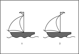 Инструкция к Заданию 1 (см. Бланк №1): на бланке изображены две парусные лодки, плывущие под действием ветра. При изображении одной из них художник допустил ошибку. Ребенок должен определить, какая лодка нарисована правильно, а какая с ошибкой. Ответ: второй рисунок неверный, так как парус и флаг на лодке не могут быть ветром направлены в противоположные стороны.
