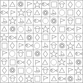 В этом задании в первой таблице приведены различные предметы и соответствующие им фигуры (элементы этих предметов). Ребенок должен запомнить их и во второй таблице нарисовать по памяти напротив каждой картинки соответствующий ей элемент