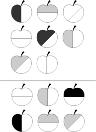 Инструкция: ребенку предлагается внимательно рассмотреть распечатанный бланк методики и ответить на вопрос: какое из яблок под чертой нужно поставить на пустое место над ней?