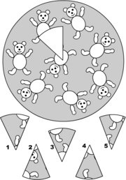 Инструкция: на бланке изображен “коврик” круглой формы с нарисованными на нем медвежатами. В одном месте “коврик порван” – не хватает фрагмента картинки. Задание: выбрать из предложенных 5 фрагментов подходящую “заплатку” для “коврика”. Чтобы проверить правильность своего решения, ребенок может вырезать выбранную им “заплатку” и наклеить ее на “коврик”.