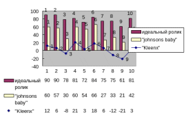 Как видно из графика на рис. 1., эмоциональное отношение испытуемых, принимавших участие в эксперименте, к разным роликам оказывается различным. Наиболее близким к "идеальному" оказался телевизионный рекламный ролик масла для тела "Johnson’s babe", то есть более высокие положительные эмоциональные оценки. Тогда как рекламный ролик туалетной бумаги "Kleenex" оценивается менее привлекательным, более глупым, вульгарным и легкомысленным. Разницу в оценках роликов можно объяснить характером рекламируемых товаров, то есть туалетная бумага носит более интимный характер и у респондентов никак не ассоциируется с детской игрушкой ("это просто не эстетично"). А ролик масла для тела, с одной стороны, носит сексуальный характер, что способствует привлечению внимания мужчин, с другой стороны, воздействие на восприятие женщин имеет 2 аспекта: