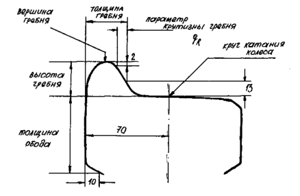 на бандажах и ободьях цельнокатных колес – отсутствие трещин, ползунов (выбоин), плен, раздавленностей, вмятин, отколов, раковин, выщербин, ослаблений бандажей, сдвига бандажа (по контрольным меткам на бандаже и ободе центра), предельную высоту гребня, его износ, подрез, ослабление бандажного кольца, опасных форм гребня и остроконечного наката является признаком возможности опасной формы гребня.
